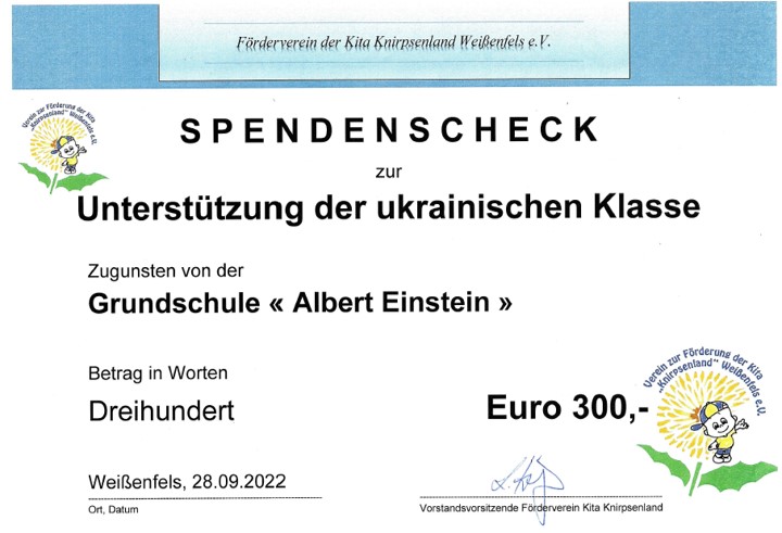 Unserer ukrainischen Ankunftsklasse wurde für die Anschaffung von Büchern ein Betrag von 300 € gespendet. Es handelt sich dabei um den Erlös aus Spenden, die zum Spiel- und Sportfest des Vereins gesammelt wurden.